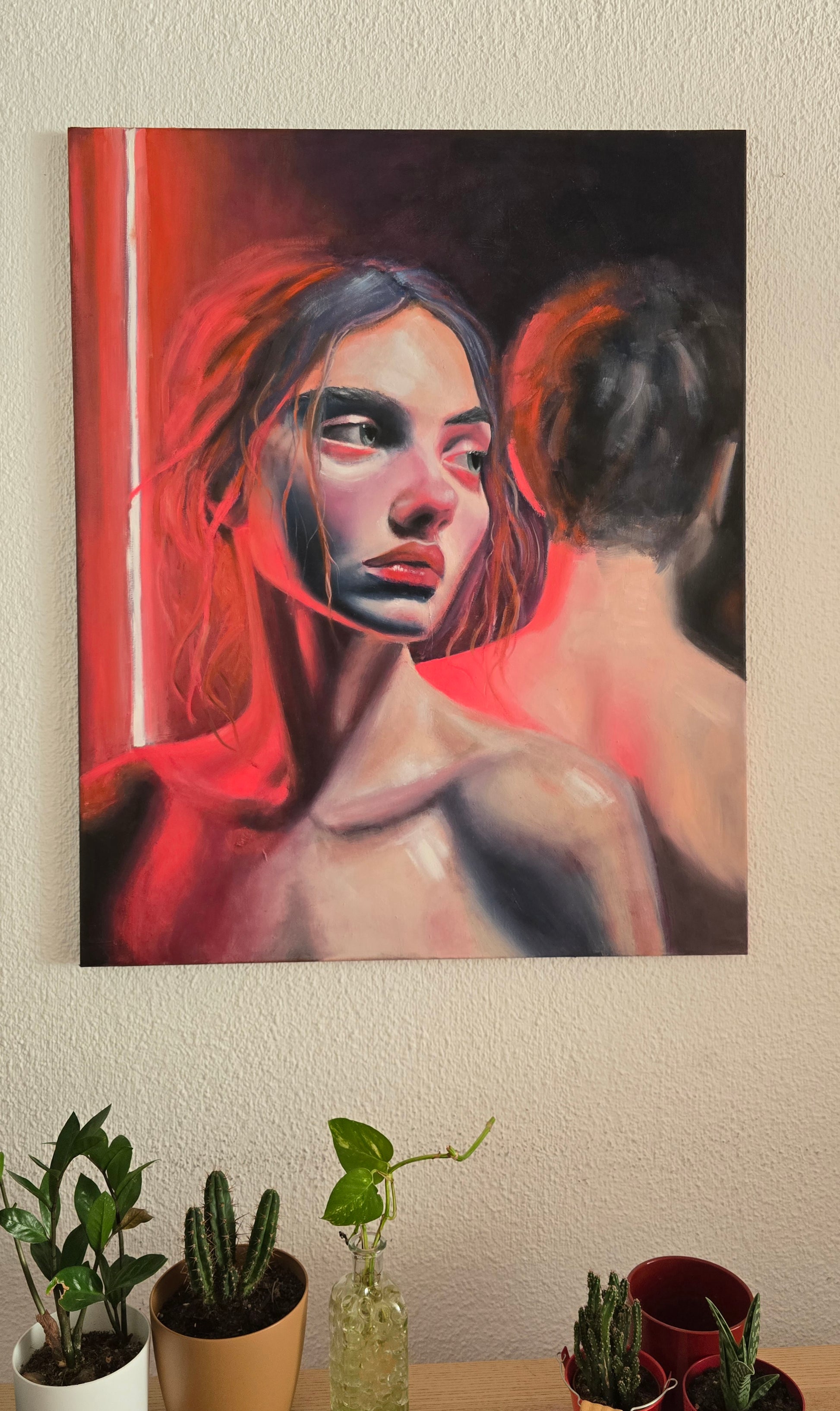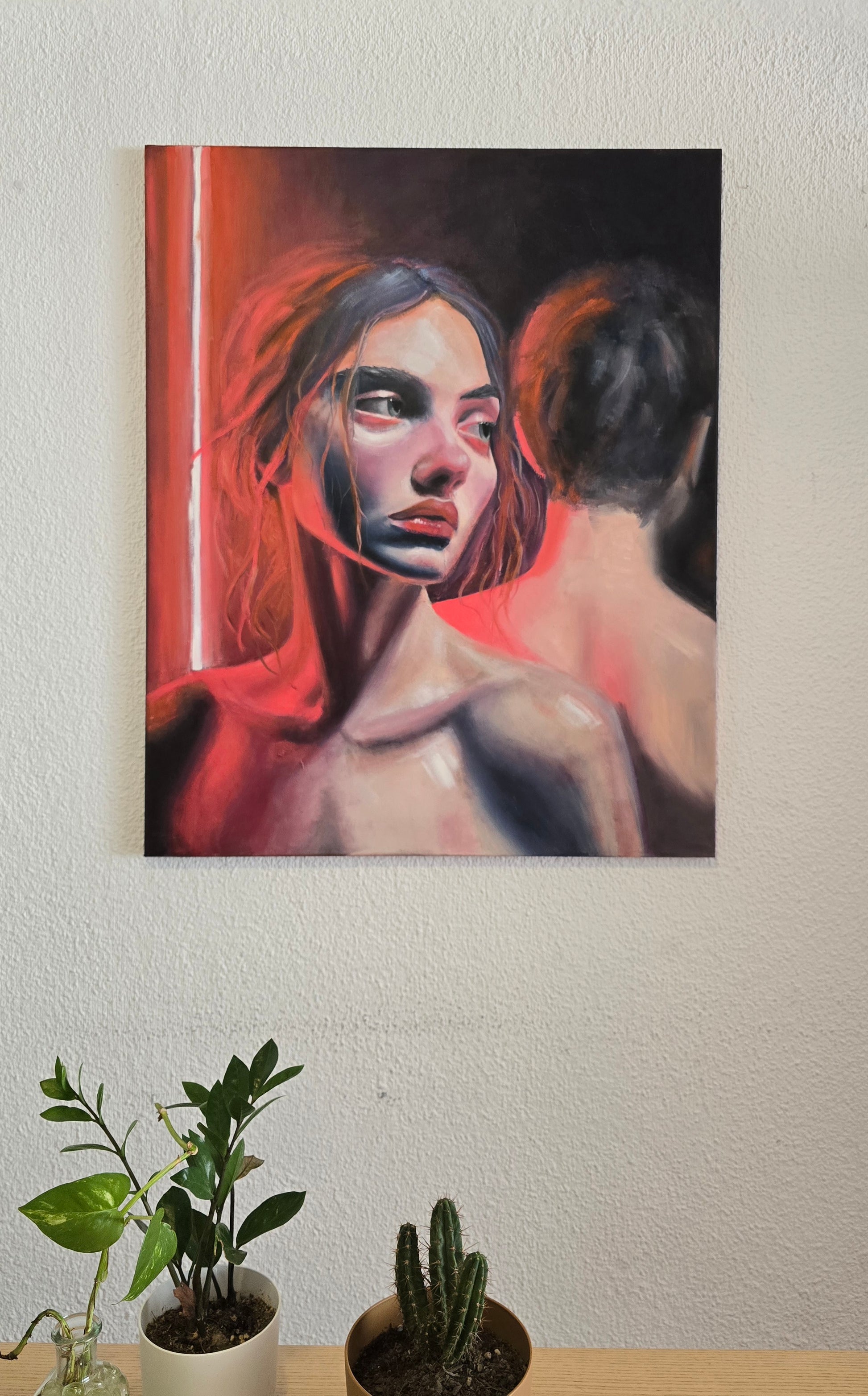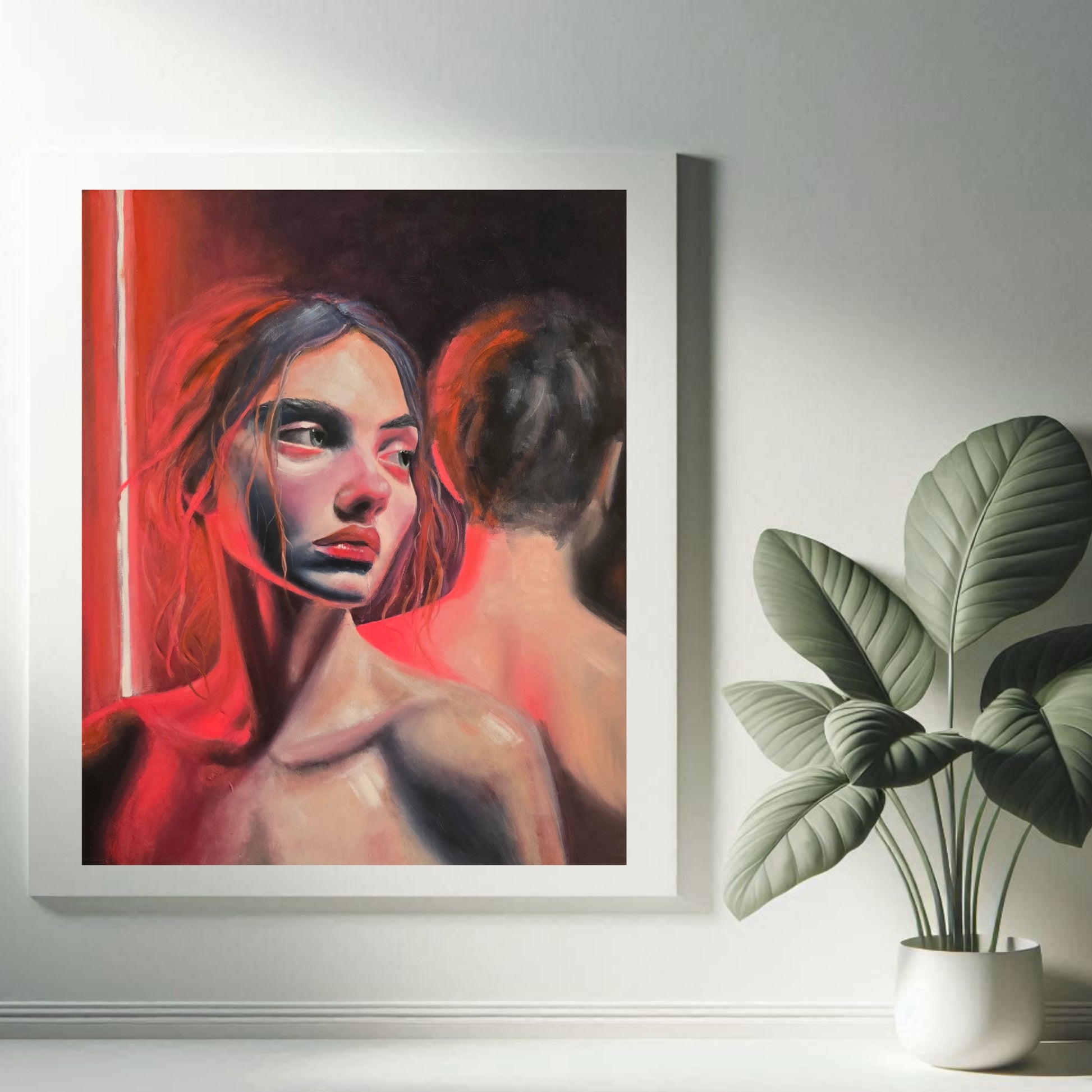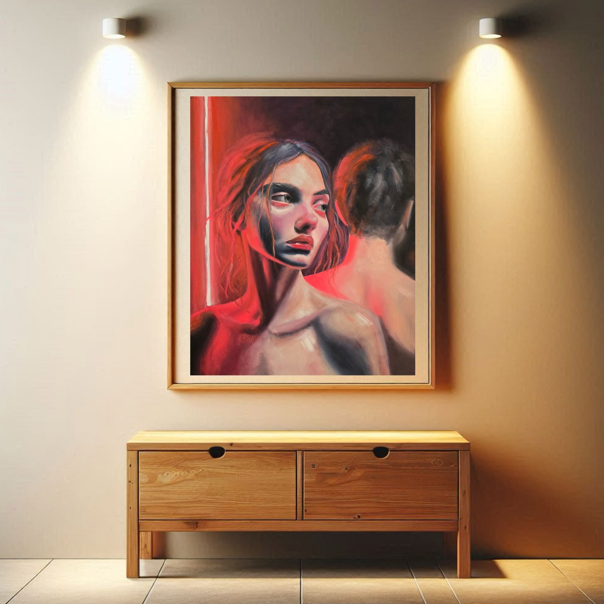 "La luz roja de neón, una silueta audaz ante la promesa de un camino que se abre ante sus ojos. Sus ojos, llenos de un anhelo silencioso, están fijos en algo que yace más allá, en una historia aún por escribir.A sus espaldas, él mira hacia atrás. Sus manos casi se tocan. El momento, la verdad, es un puente que debe cruzarse. Pero en la noche, el neón y el silencio permanecen, inquebrantables, custodiando la distancia que los separa."