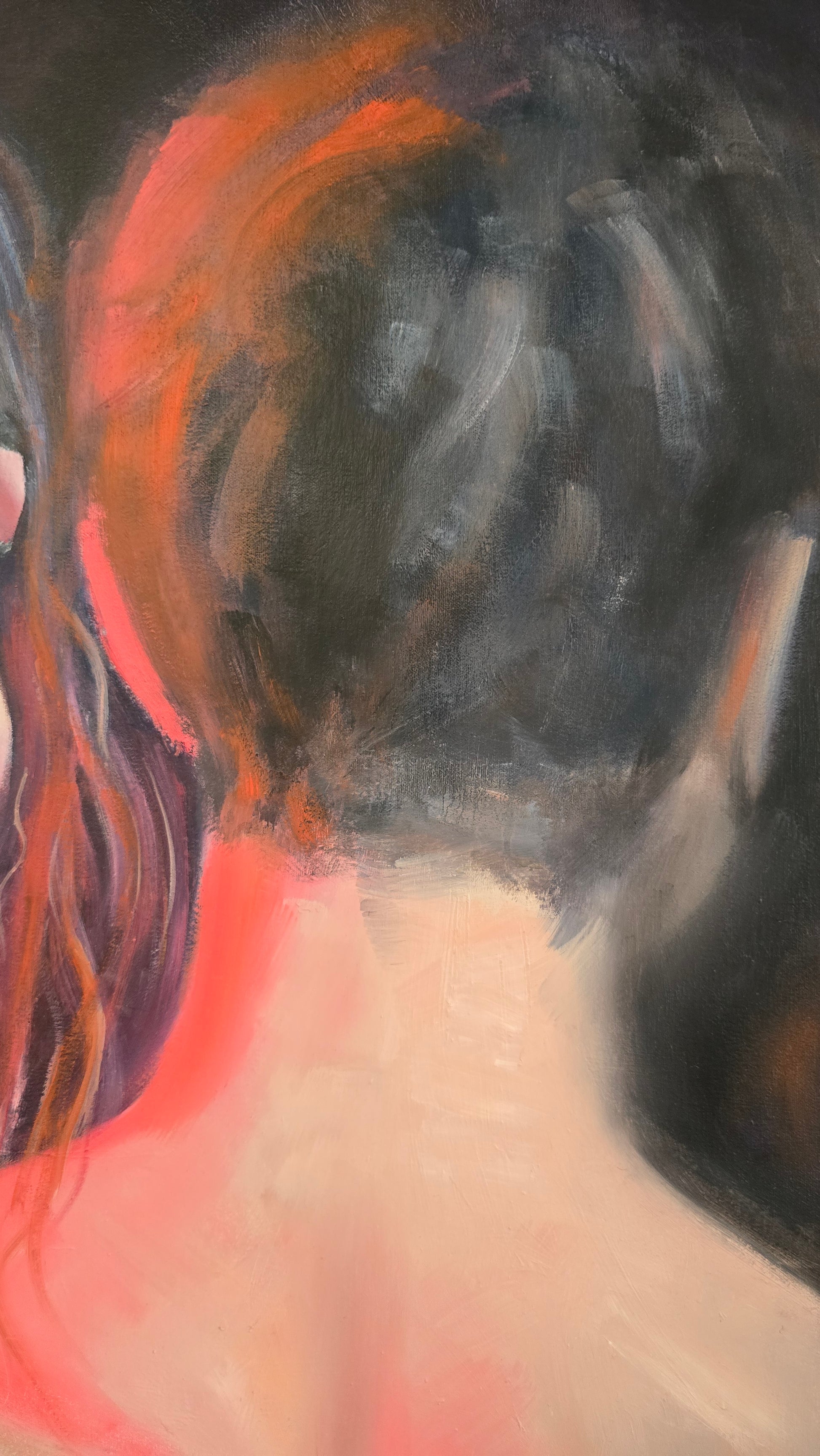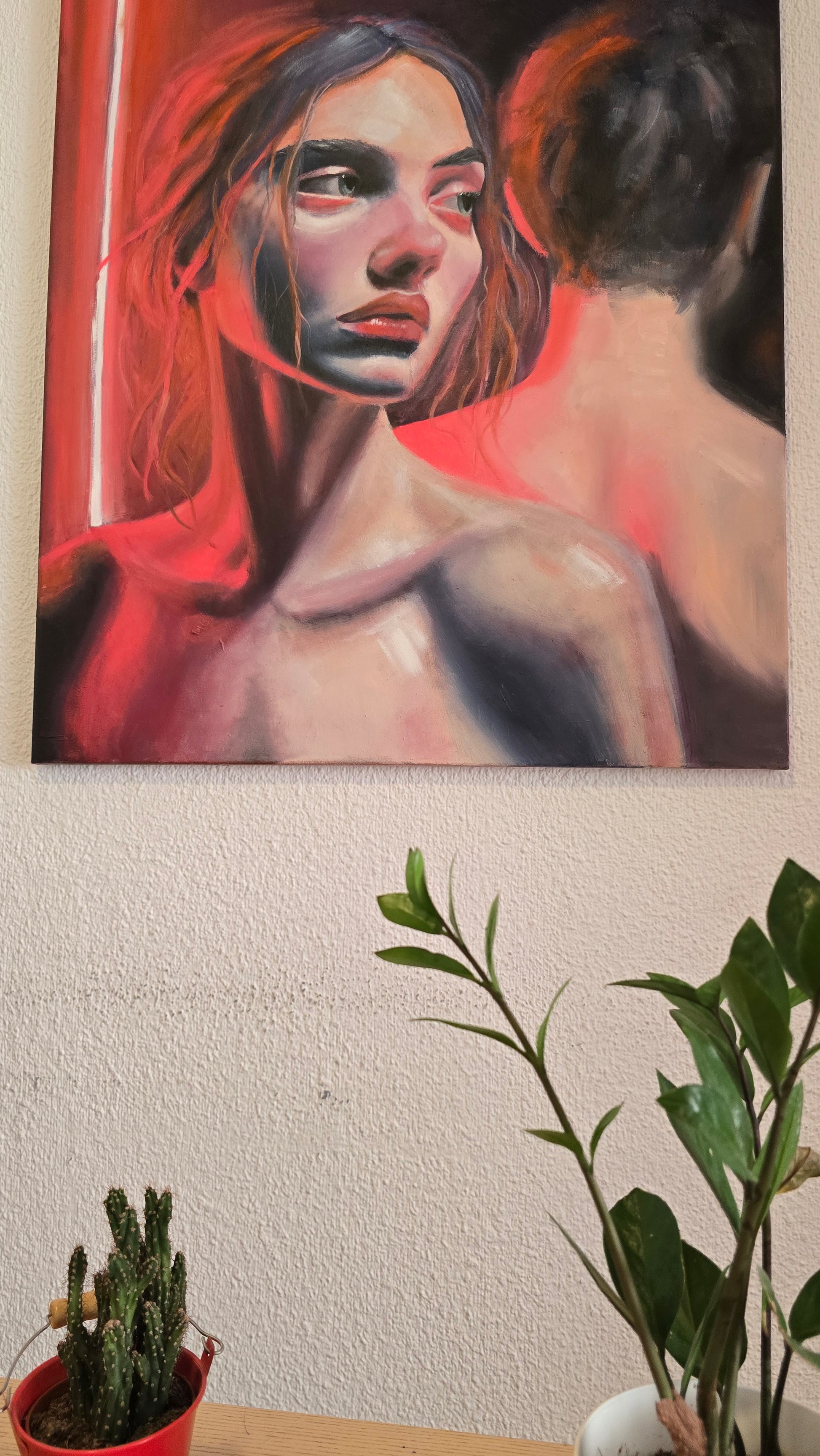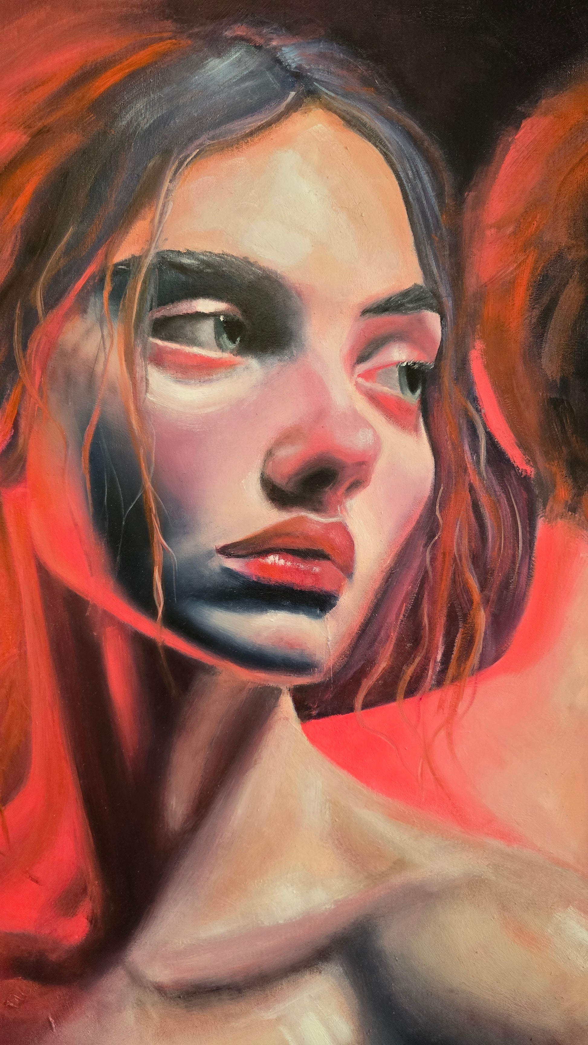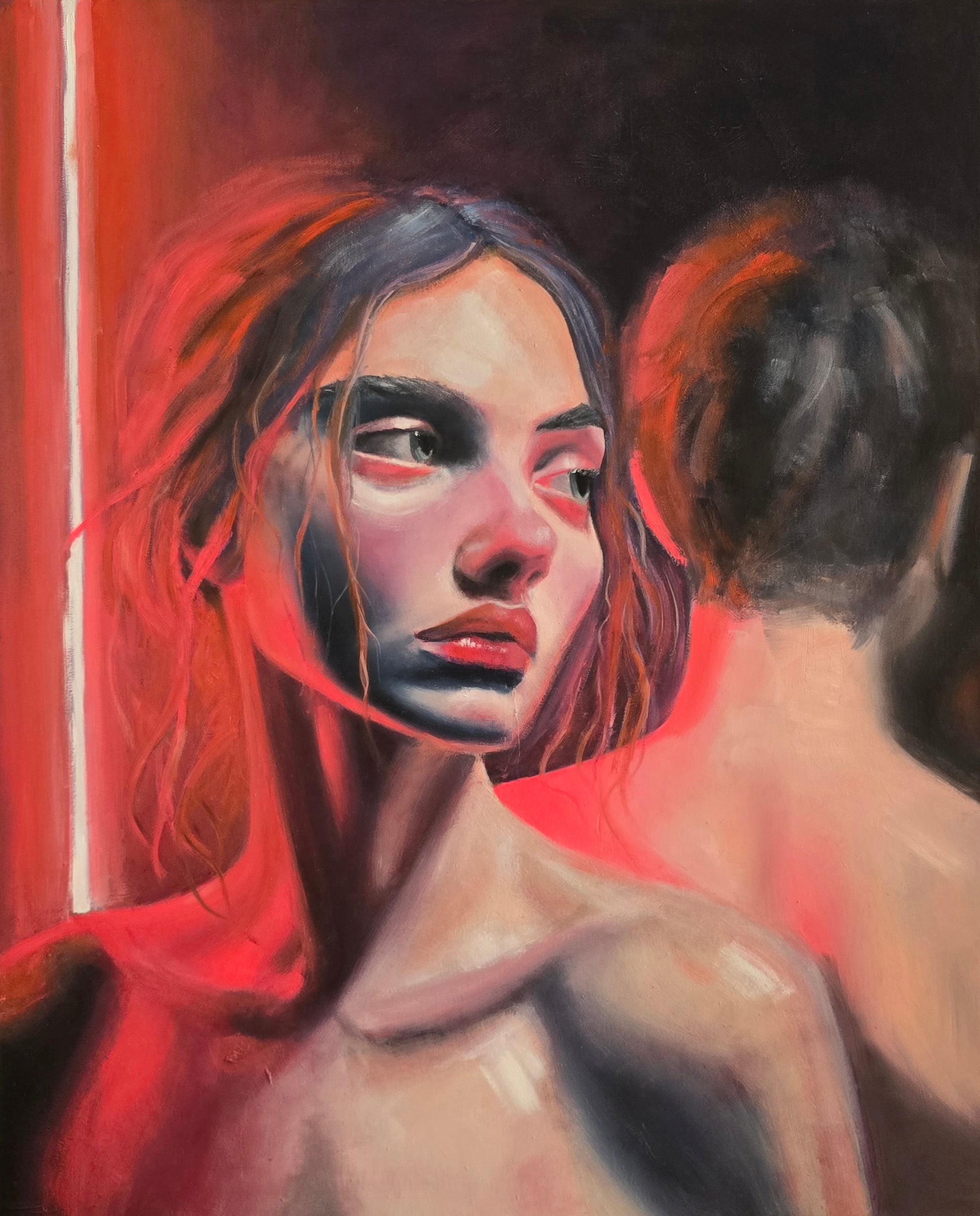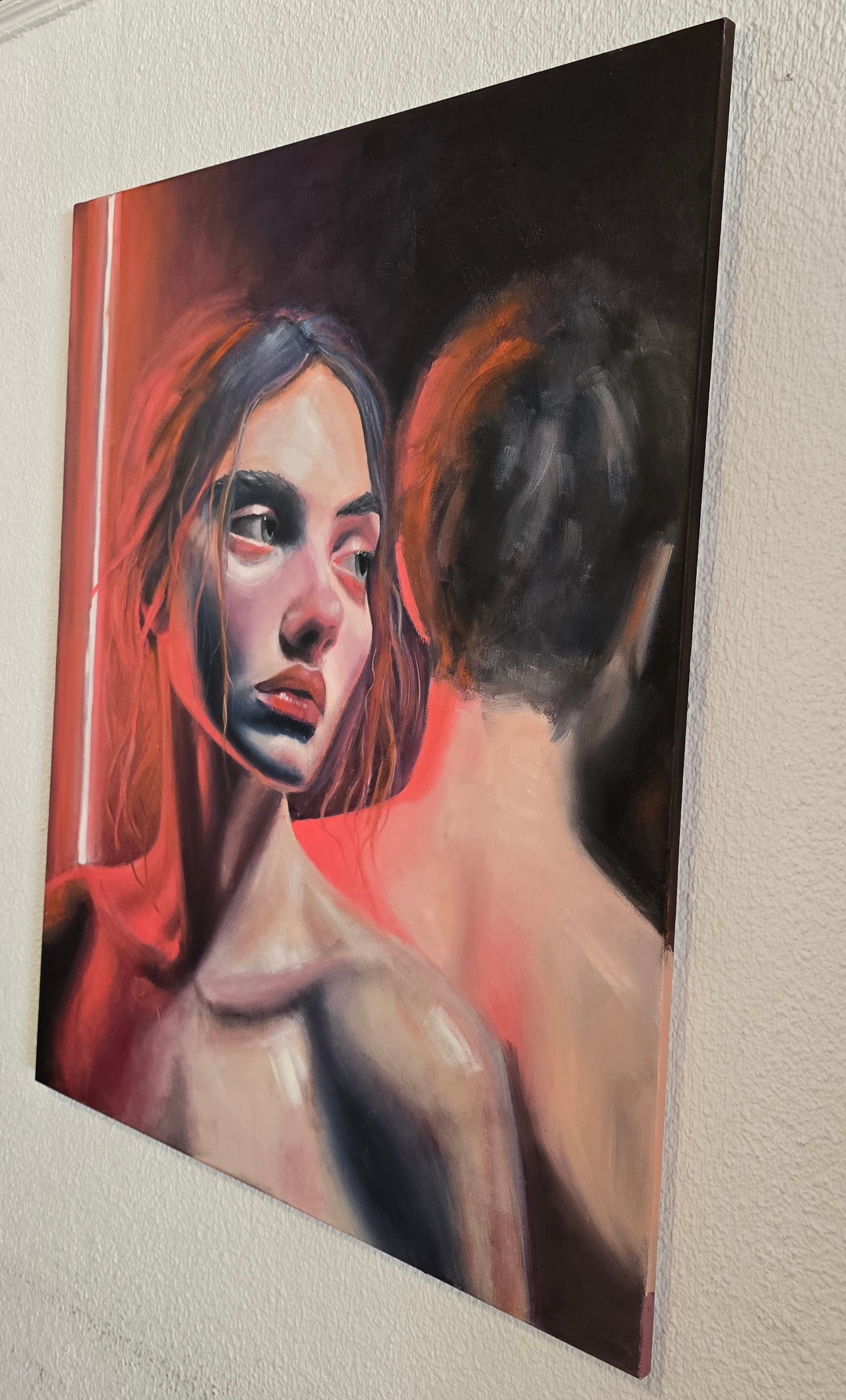 "La luz roja de neón, una silueta audaz ante la promesa de un camino que se abre ante sus ojos. Sus ojos, llenos de un anhelo silencioso, están fijos en algo que yace más allá, en una historia aún por escribir.A sus espaldas, él mira hacia atrás. Sus manos casi se tocan. El momento, la verdad, es un puente que debe cruzarse. Pero en la noche, el neón y el silencio permanecen, inquebrantables, custodiando la distancia que los separa."