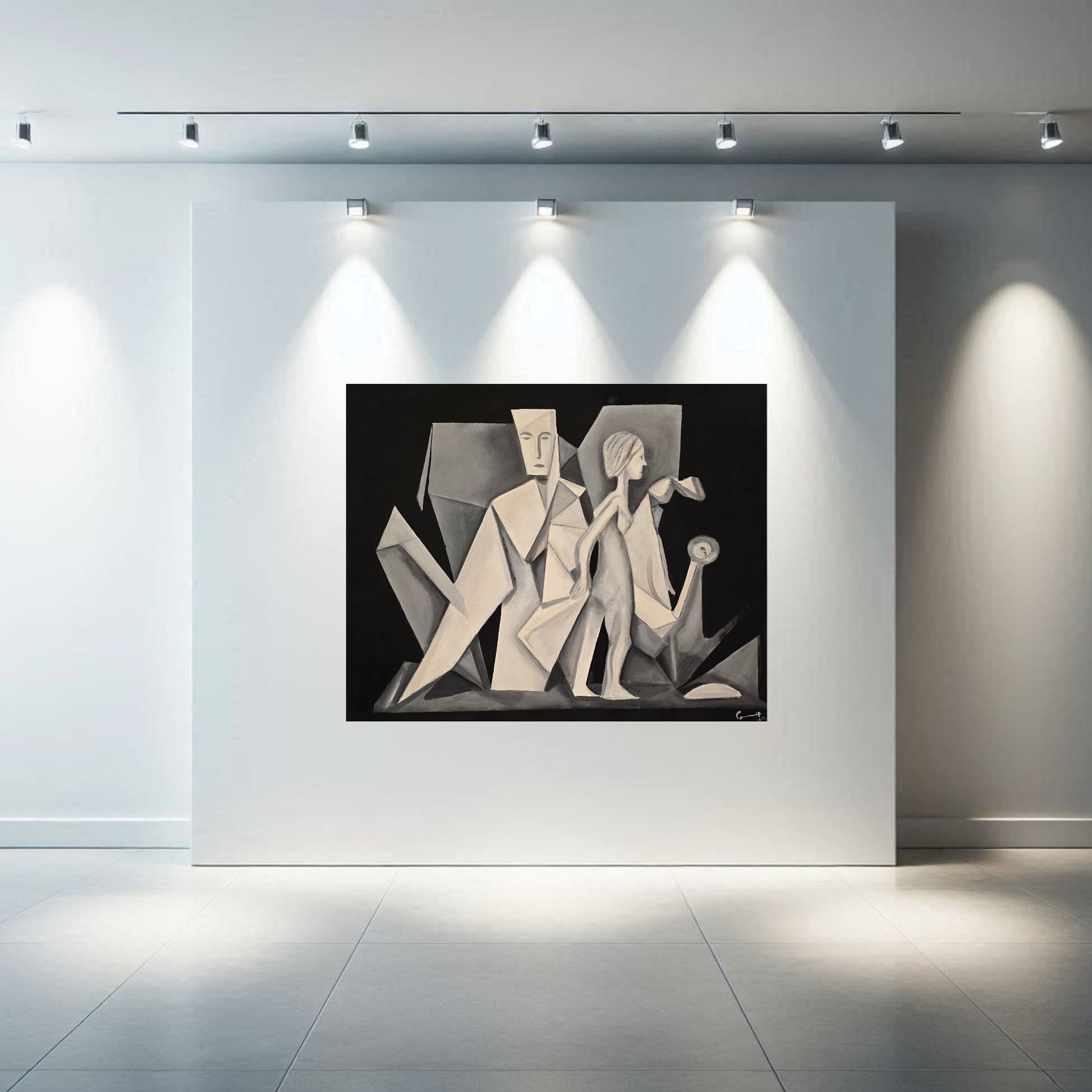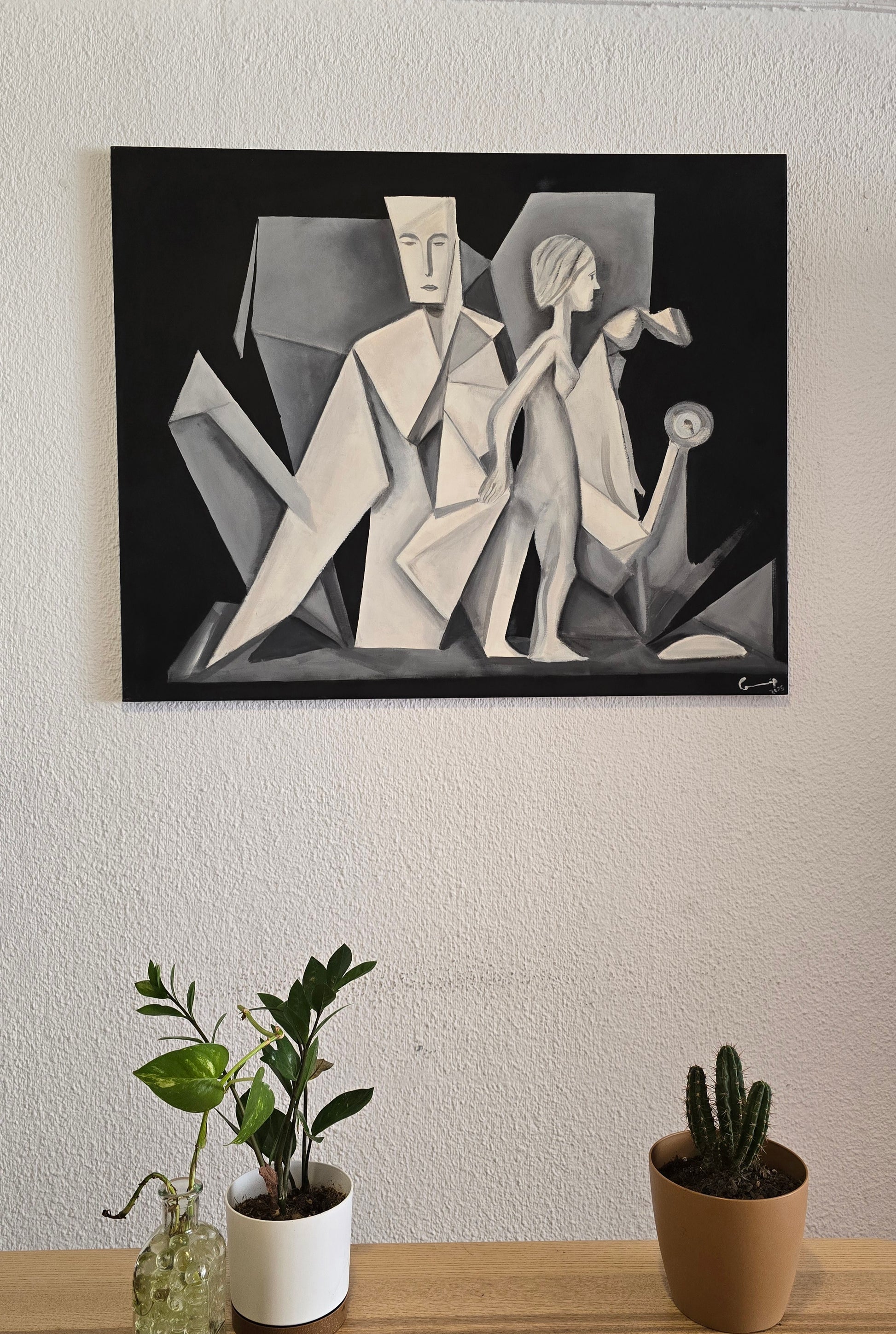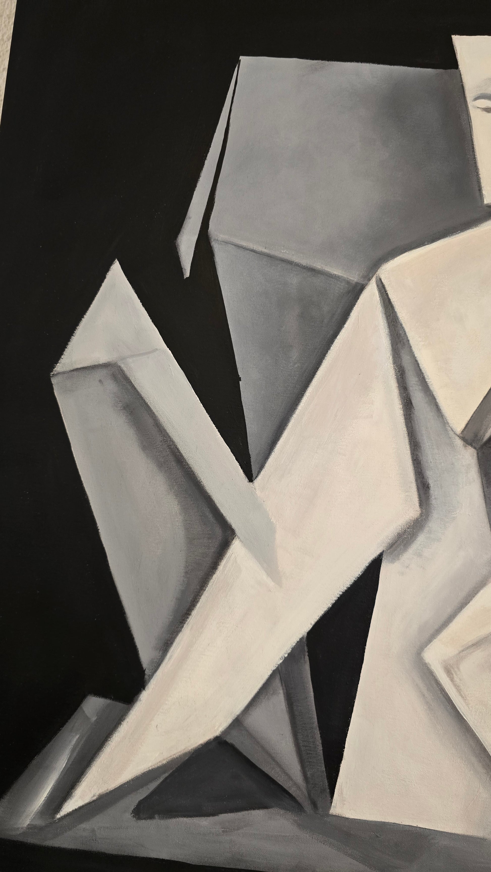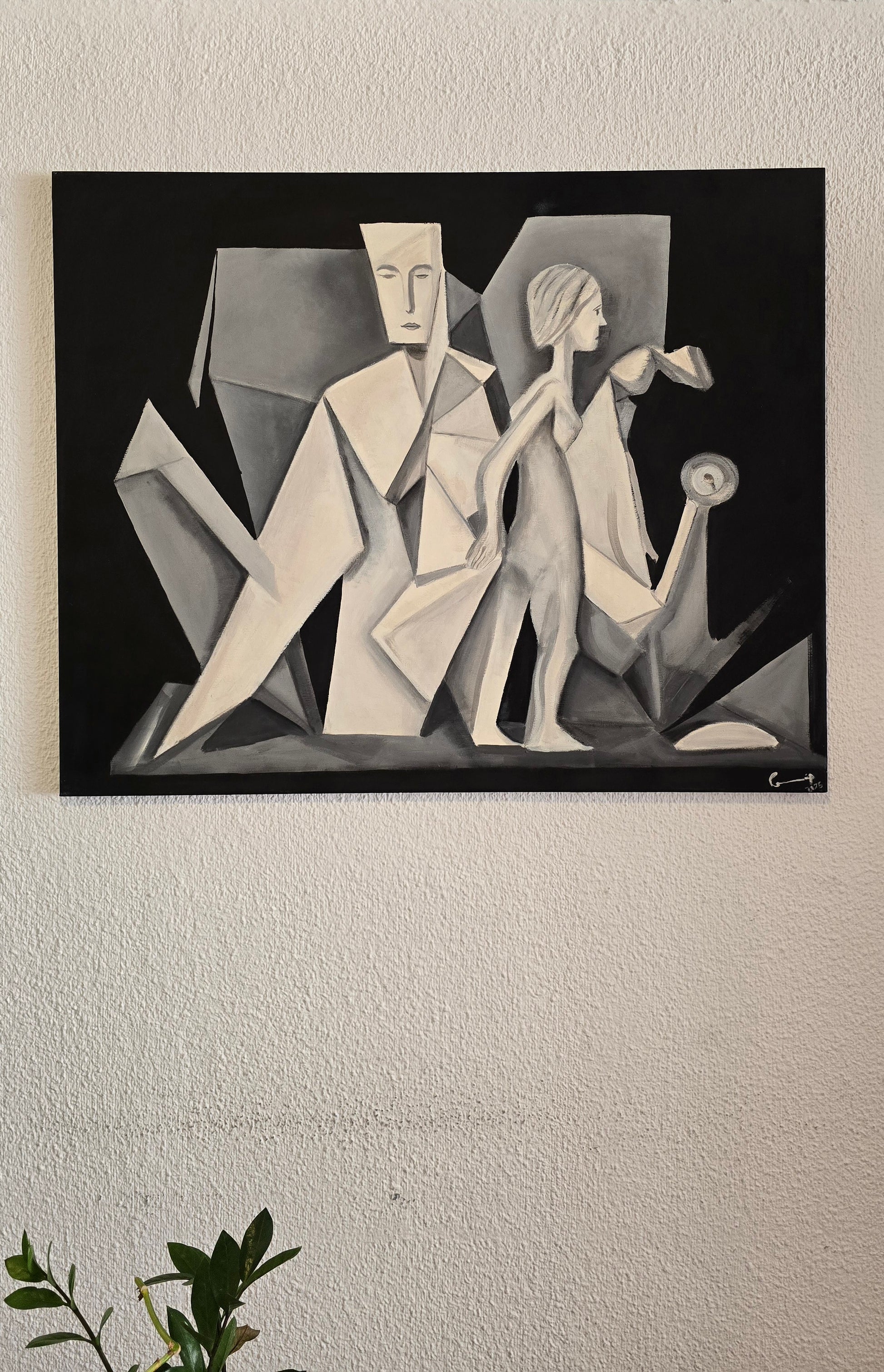"Esta pintura habla de espera, vulnerabilidad e incertidumbre. A través de formas fragmentadas, captura la quietud de un momento crucial: un brazo extendido, suspendido en el aire, esperando una caricia."