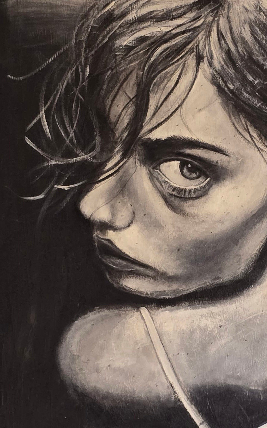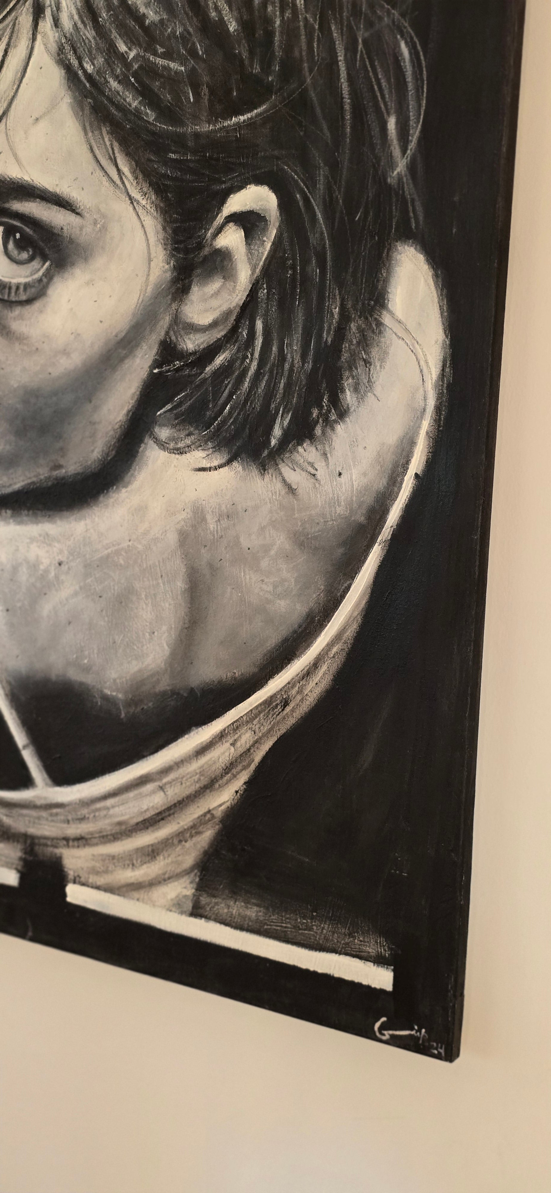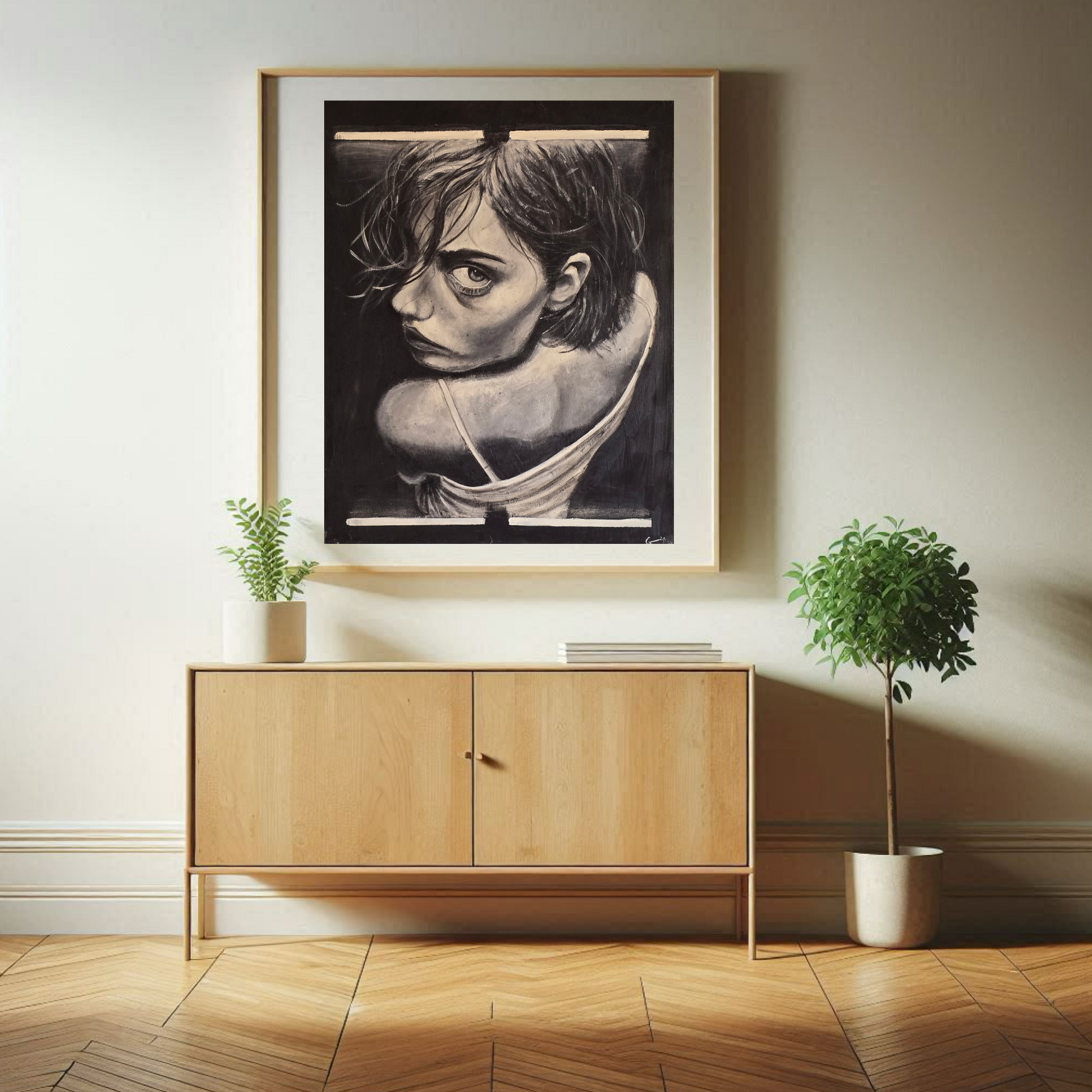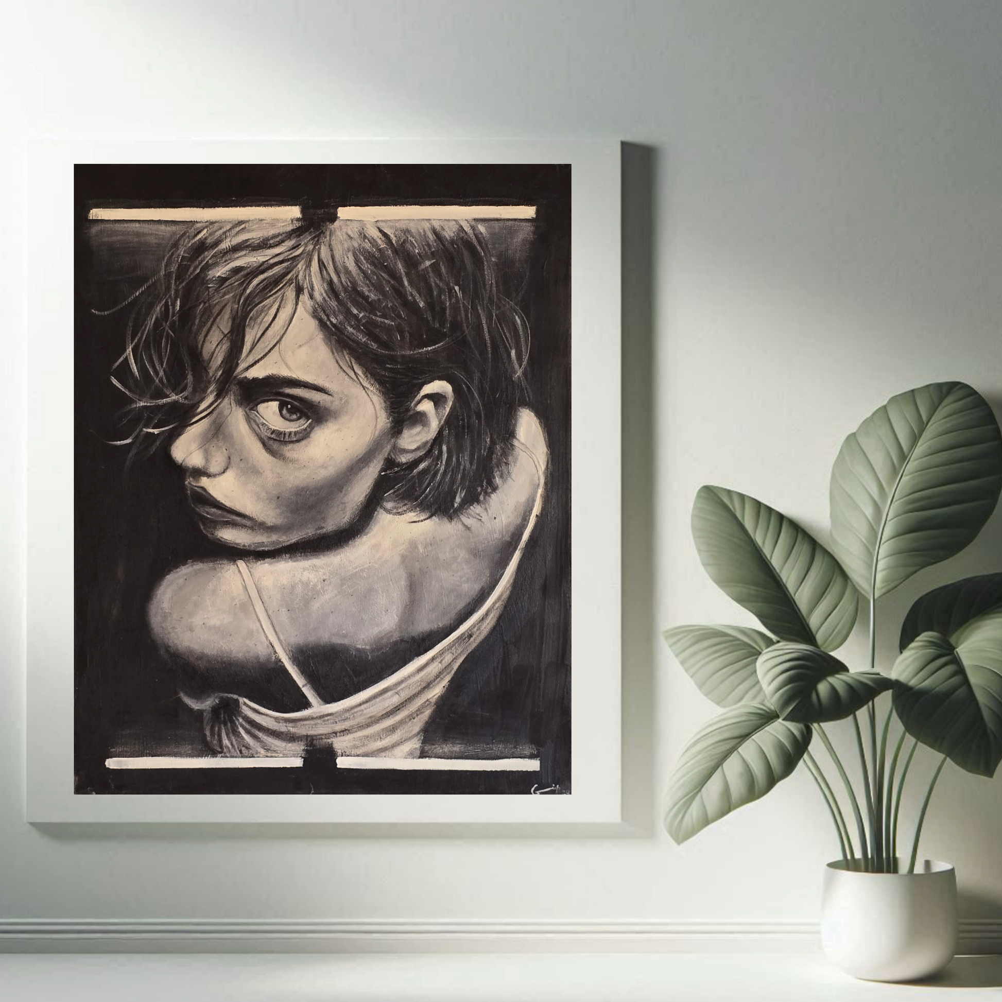 "Está sentada, pero su cuerpo no descansa. Se inclina ligeramente, como si el pasado la atrajera con una fuerza invisible. Es una mirada que no pide nada, solo recuerda. Es la mirada de alguien que ha viajado a través del tiempo sin moverse un ápice, la mirada de un alma que sabe que el lugar que una vez habitó nunca lo abandonará por completo."