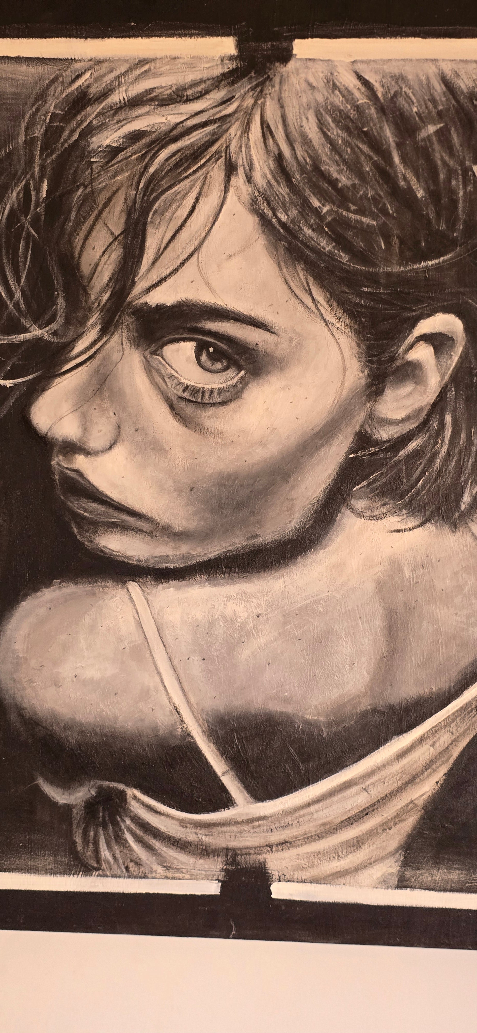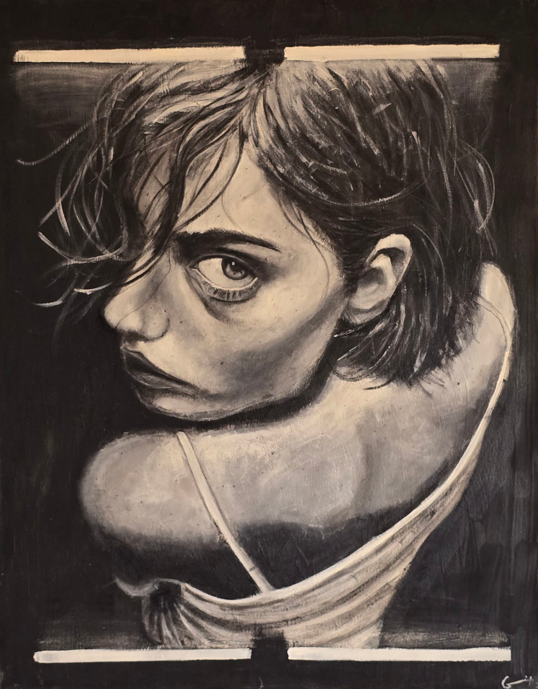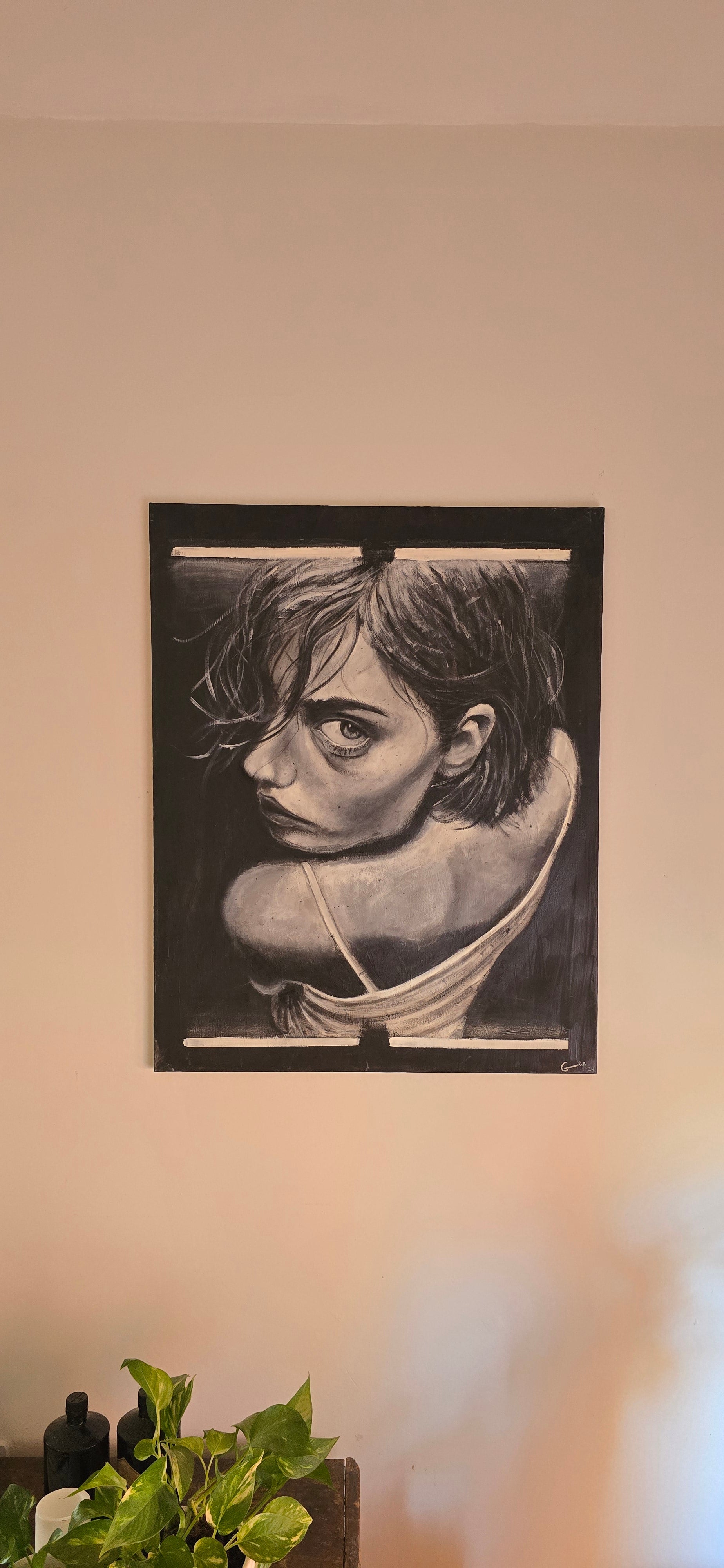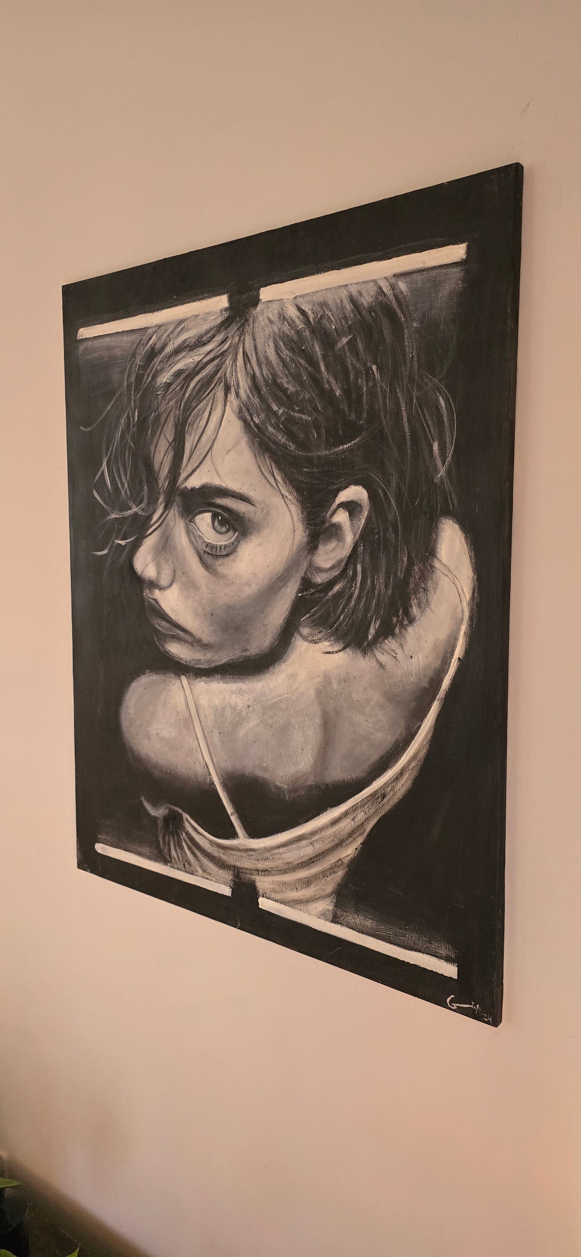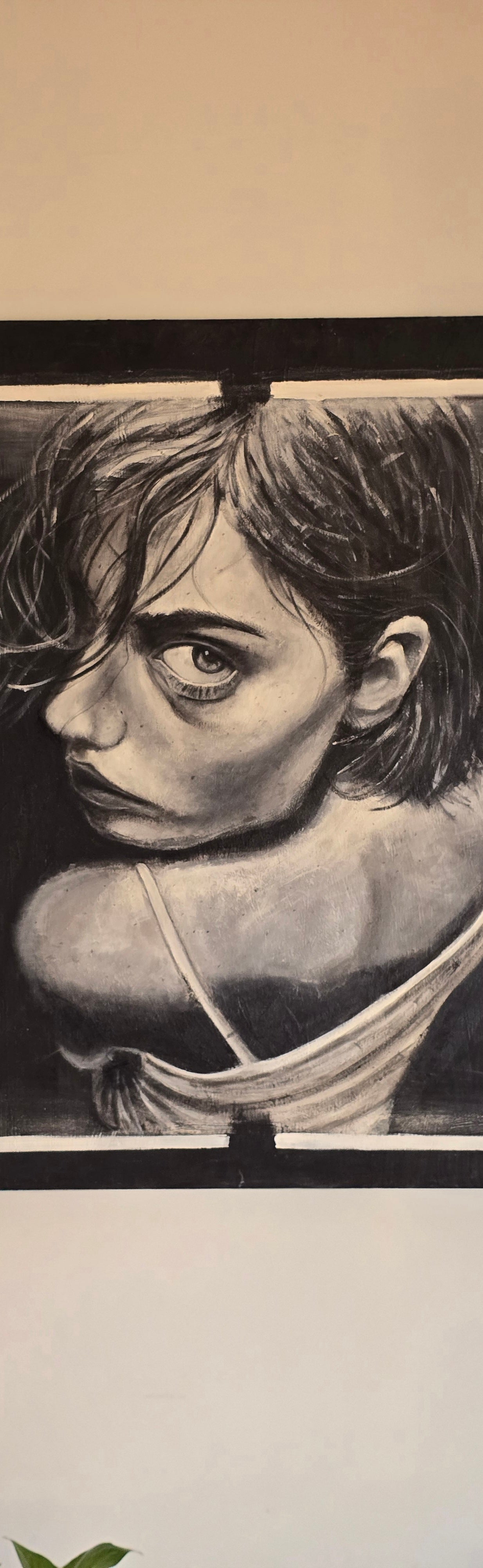 "Está sentada, pero su cuerpo no descansa. Se inclina ligeramente, como si el pasado la atrajera con una fuerza invisible. Es una mirada que no pide nada, solo recuerda. Es la mirada de alguien que ha viajado a través del tiempo sin moverse un ápice, la mirada de un alma que sabe que el lugar que una vez habitó nunca lo abandonará por completo."